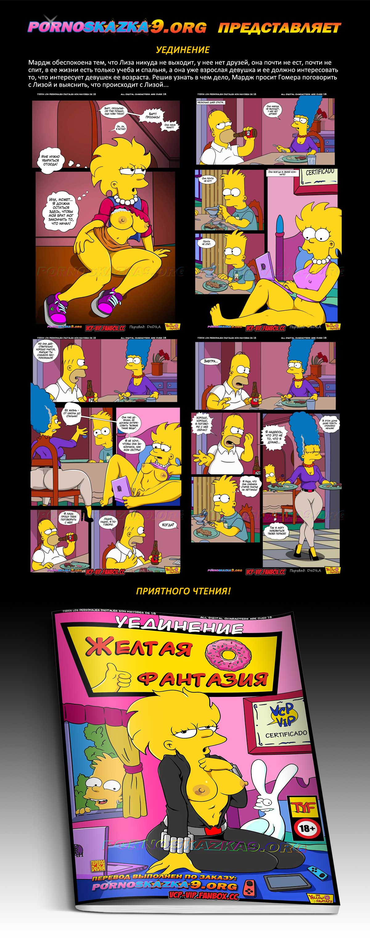 Порно комикс Симпсоны. «Уединение.» Мардж обеспокоена тем, что Лиза никуда не выходит, у нее нет друзей, она почти не ест, почти не спит, в ее жизни есть только учеба и спальня, а она уже взрослая девушка и ее должно интересовать то, что интересует девушек ее возраста. Решив узнать в чем дело, Мардж просит Гомера поговорить с Лизой и выяснить, что происходит с Лизой…